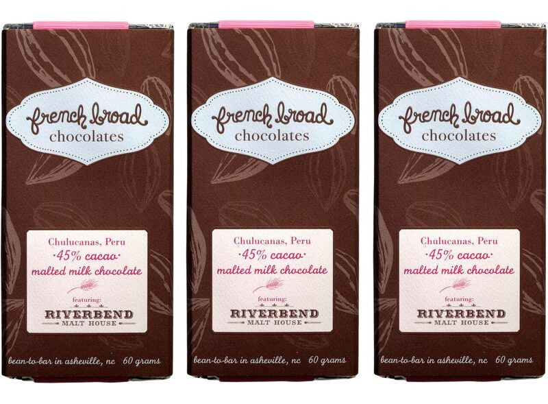French Broad's creamy, rich, malted dark milk chocolate bar is made with malted barley flour from Asheville's Riverbend Malt House and milled by Carolina Ground L3C. With hints of nutmeg and cinnamon and a little texture thanks to the local grass-fed, organic milk powder they use, it's like a malted milk ball transformed into a sophisticated chocolate bar. Dreamy.