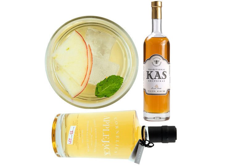 Start with a delicious liqueur made from, yes, apples. Harvest Spirits' Cornelius Applejack uses 60 pounds of fresh apples in each bottle, in fact. Mix it with Kas Krupnikas Honey Liqueur, a sweet honey liqueur spiced with vanilla, cinnamon and cardamom. Stir with ice and garnish with fresh mint leaves and a few apple slices. Huzzah!