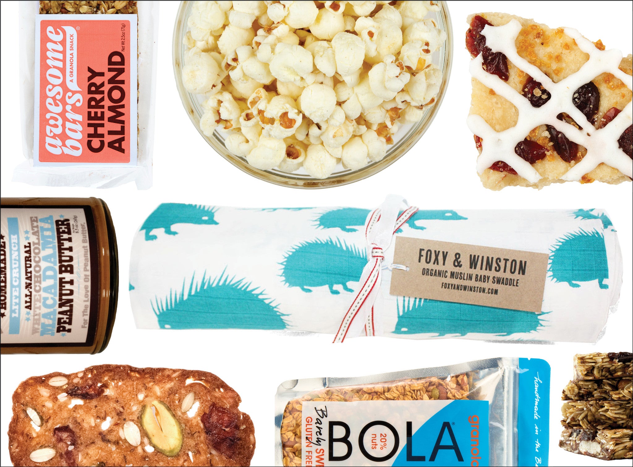 Introducing our Hey, Baby! Gift Bag: This collection of easy, healthful snacks and treats will make their sleepless nights a little easier. And the adorable hedgehog-patterned swaddle blanket made with organic muslin by Brooklyn's Foxy & Winston is a total keeper.
