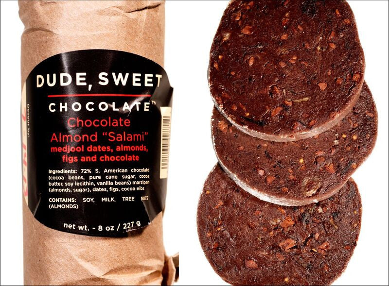 The words “chocolate salami” may split a crowd as fast as “cilantro,” “candy corn” or “Woody Allen.” None seem to foster a middle ground. But whether you’re on the eww, gross side of the room or the mmm, yummy side, we’ve got news for you: the chocolate salami made by Dude, Sweet Chocolate is totally odd and totally delicious.