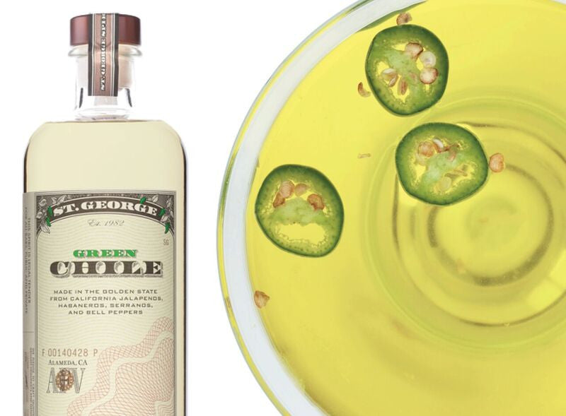 St. George Spirits makes their Green Chile Vodka from a variety of California-grown hot and sweet peppers (jalapeños, serranos, habaneros and red and yellow bell peppers) with a little lime peel and cilantro to balance out their heat. Yep, your cocktail is gonna be lit.