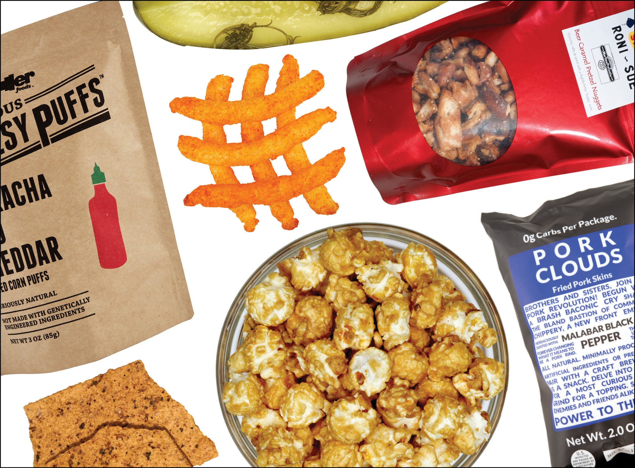 Question: What's more awesome than a bunch of friends and family members crowding around a screen, screaming, howling, cursing, eye-rolling, fist-pounding and high-fiving? (And, by the way, that's only the commercials! Ba dum dum.) Answer: Munching, chomping and demolishing their way through the line of small-batch scrimmage, aka. a coffee table covered with winning crispy, chewy and flavorful snacks like Sriracha cheesy puffs, bacon kettle corn and crunchy, salty pork rinds.