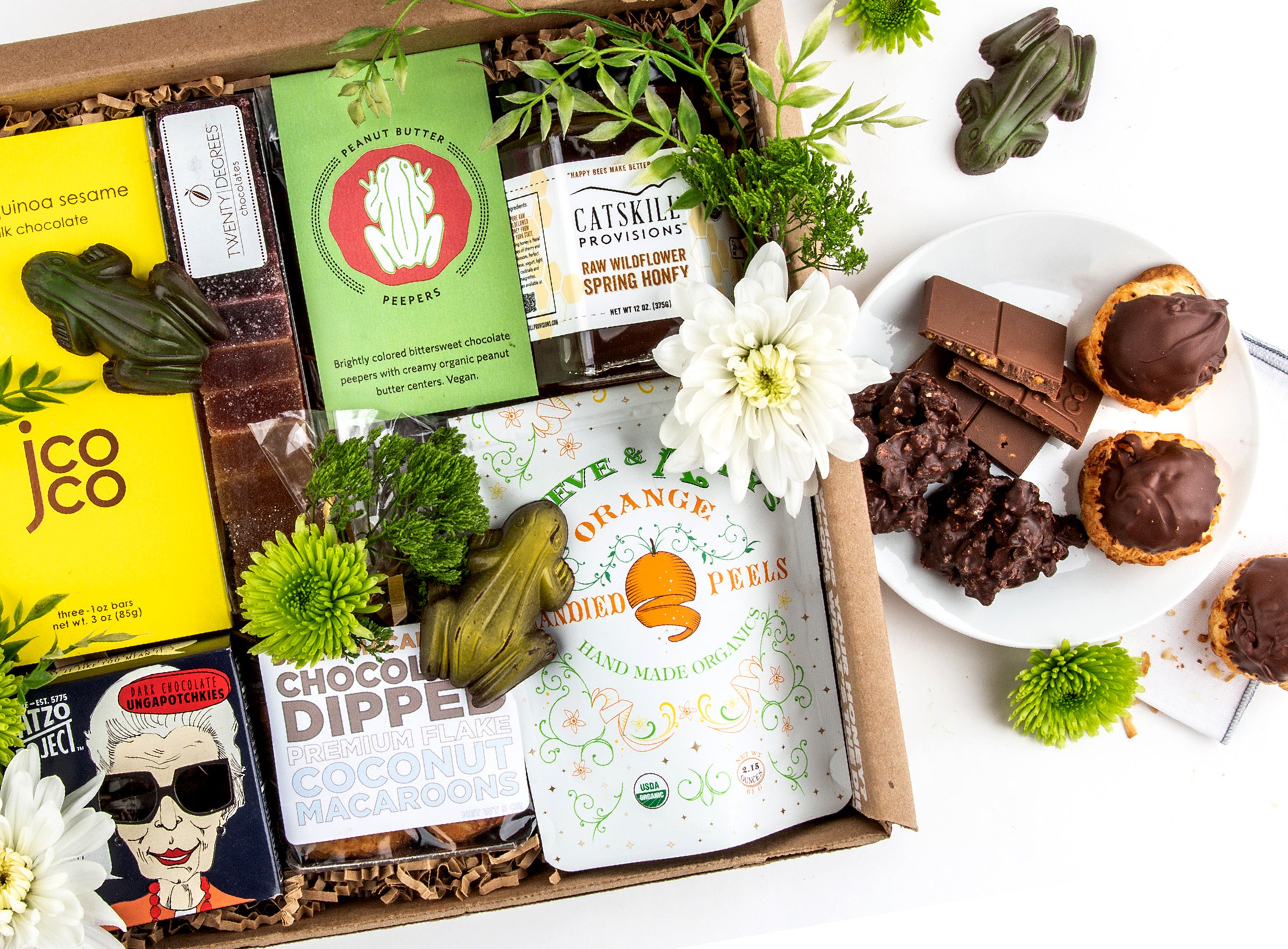 Chocolate-Covered Peanut Butter Frogs: Why are these purple, green, and yellow froggies hopping into this Passover desserts gift box? These little peepers remind us of the 10 plagues of Moses, specifically plague #2. Creamy, dreamy vegan peanut butter is coated in a bittersweet Venezuelan chocolate shell. Forget plague. These are manna from Heaven.
