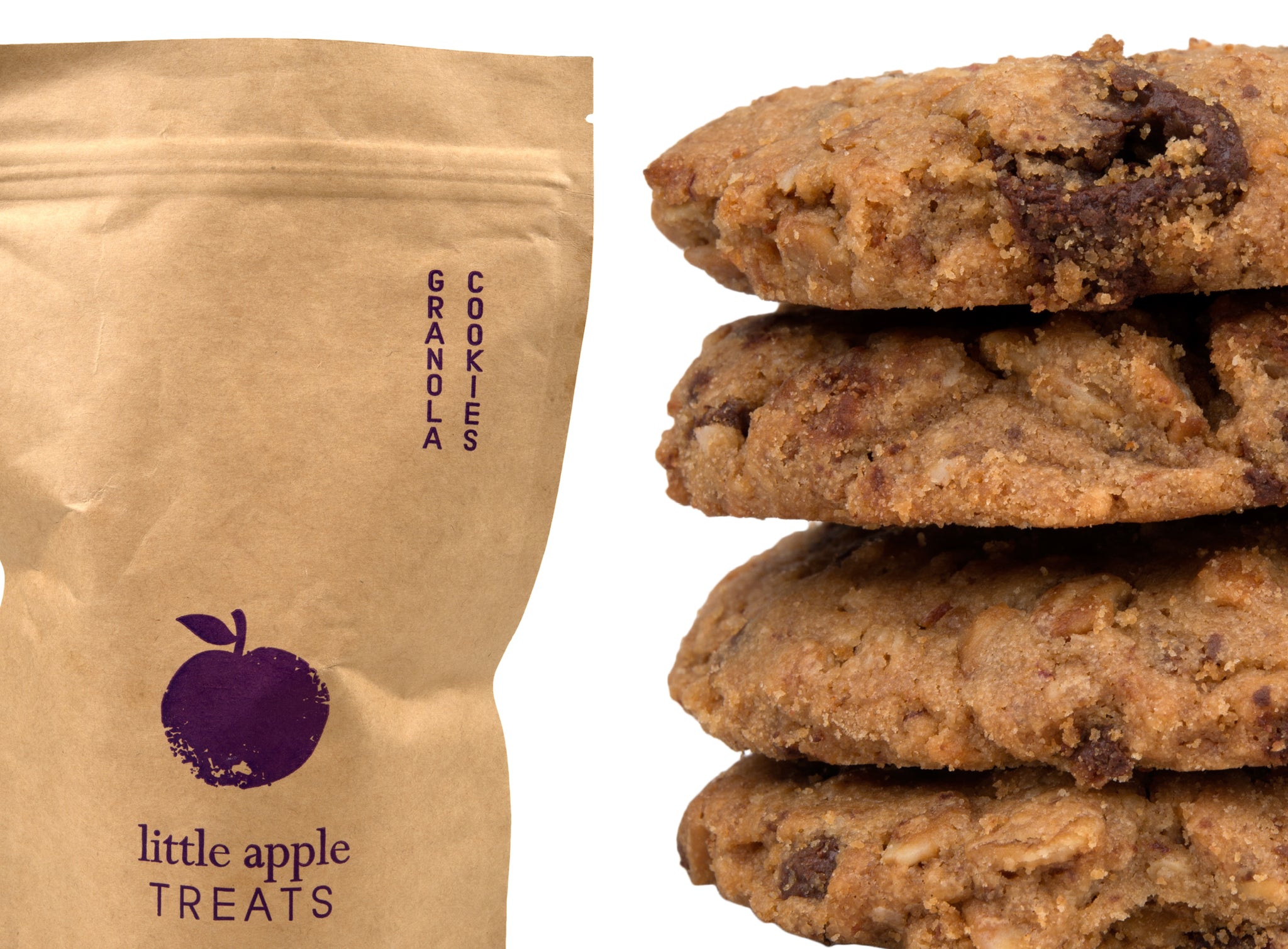 Yes, we find ourselves snacking on granola anytime, anywhere, but we have to admit it gets a little messy. The solution to our fix? Apple + Chocolate Chip Granola Cookies made by Little Apple Granola in Sebastopol, California!