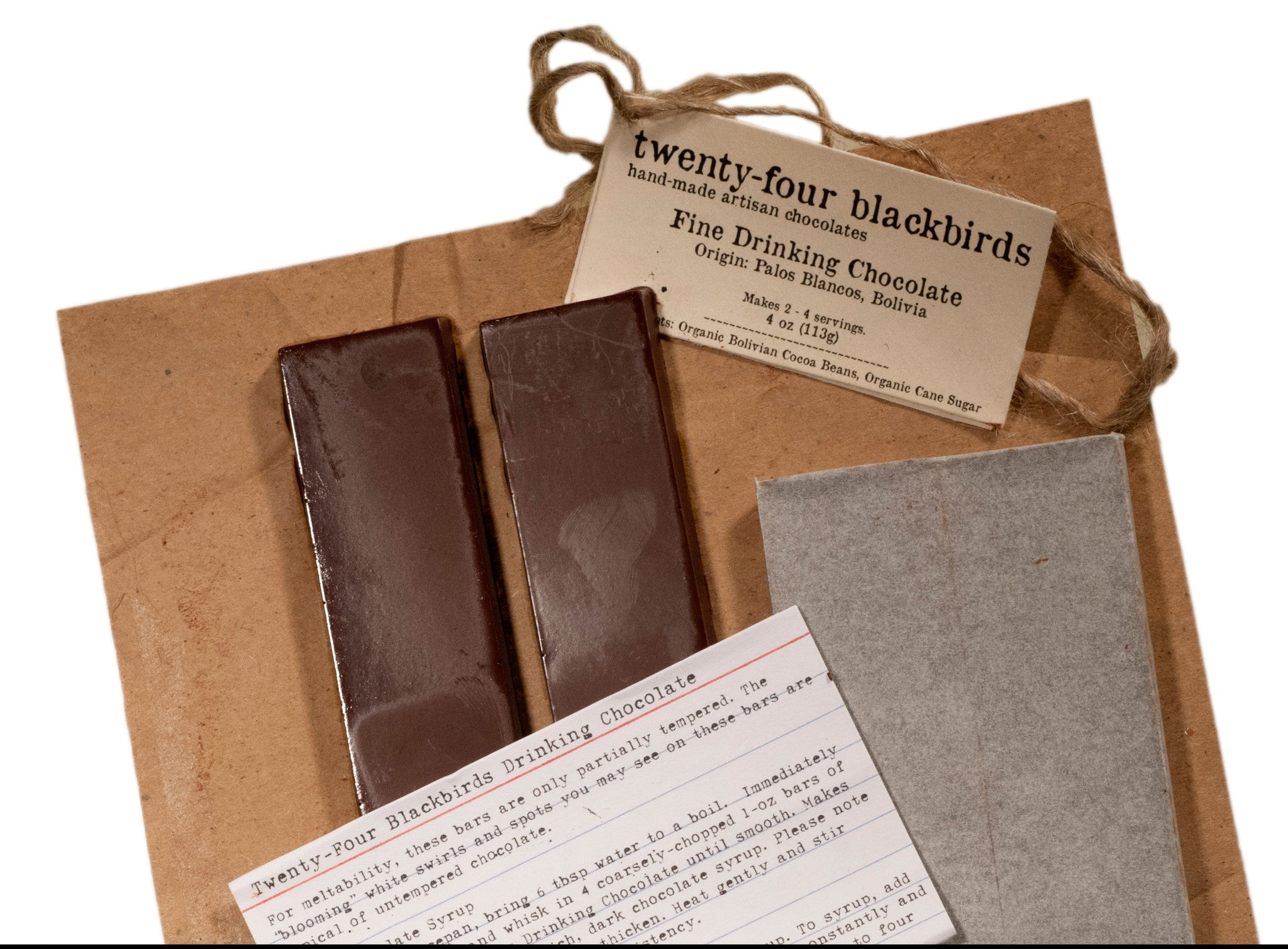 This kit is intended to make two extremely rich servings, but if you like a less intensity (all the better for marshmallows), it can easily make four cups. Here’s how: In a small saucepan, bring six tablespoons water to a boil. Immediately remove from heat and whisk in four coarsely-chopped one-ounce bars of Twenty-Four Blackbirds drinking chocolate until smooth. Add 1 ½ cups of milk (or up to three cups as desired). Whisk constantly and heat gently to desired drinking temperature.